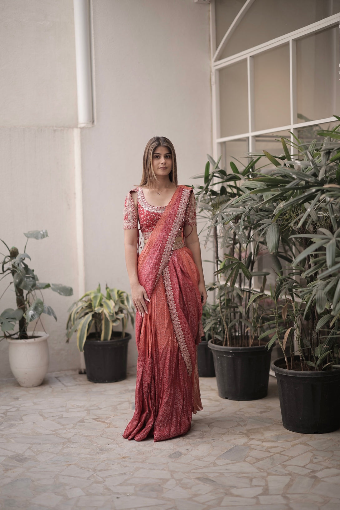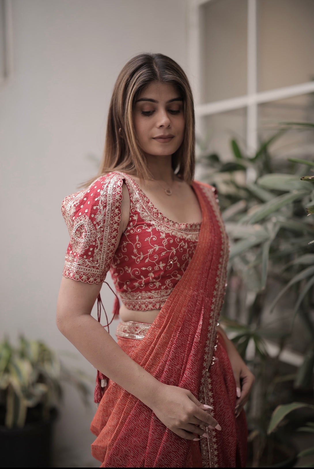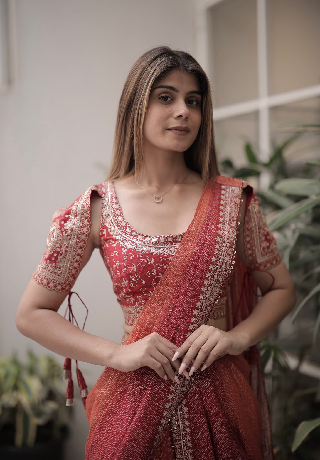 Fabric - Banarsi Colour: Rust + Red Embroidery Details: Hand Embroidered Delivery Time: 10 days Wash Care: Dry Wash Only Availability: Made To Order Customization Available: no