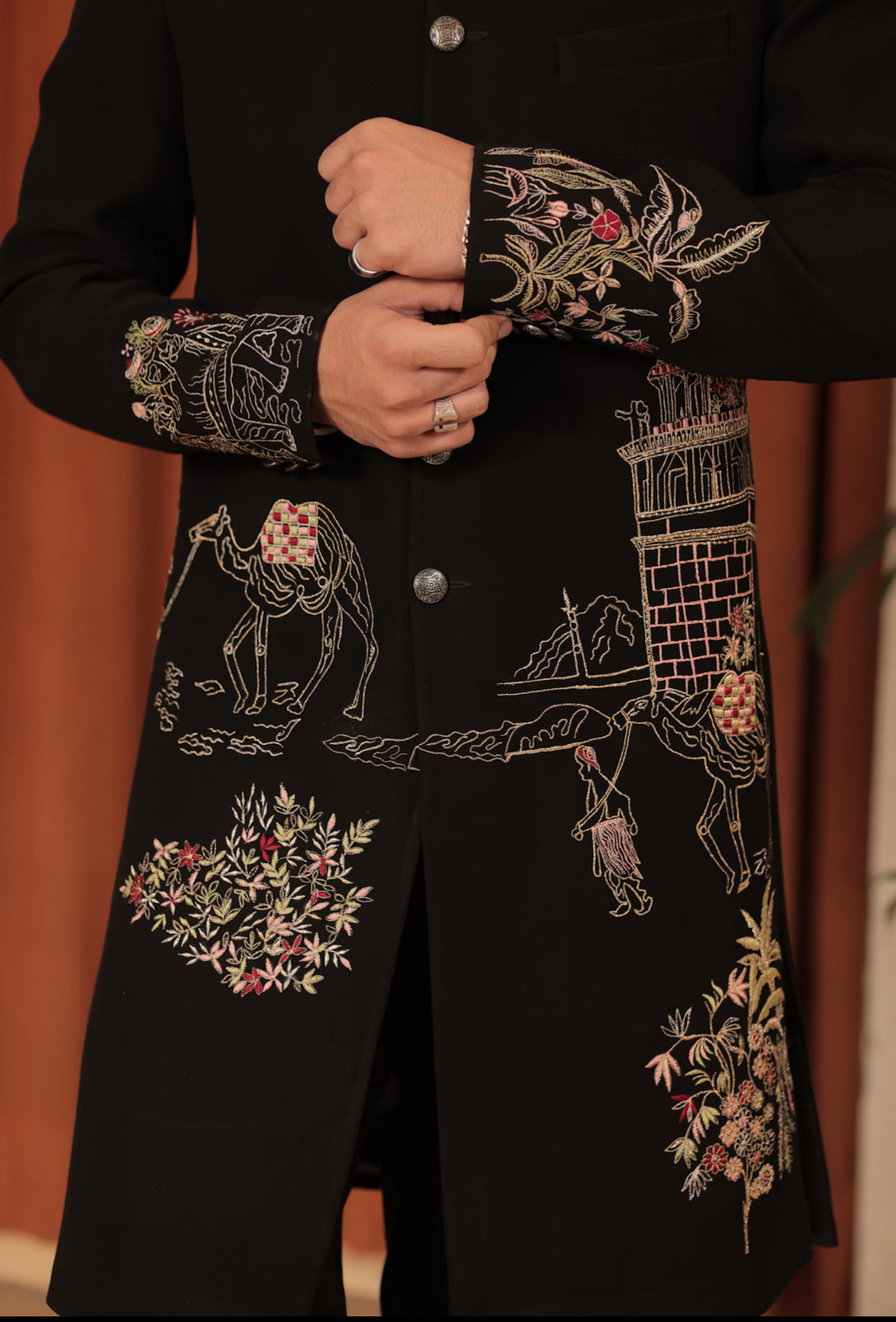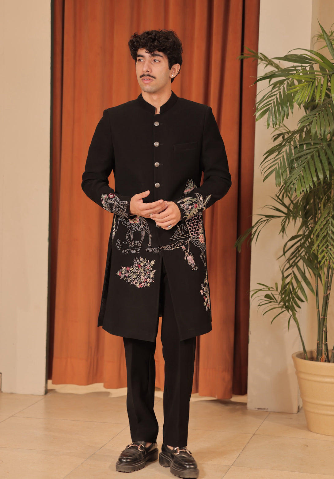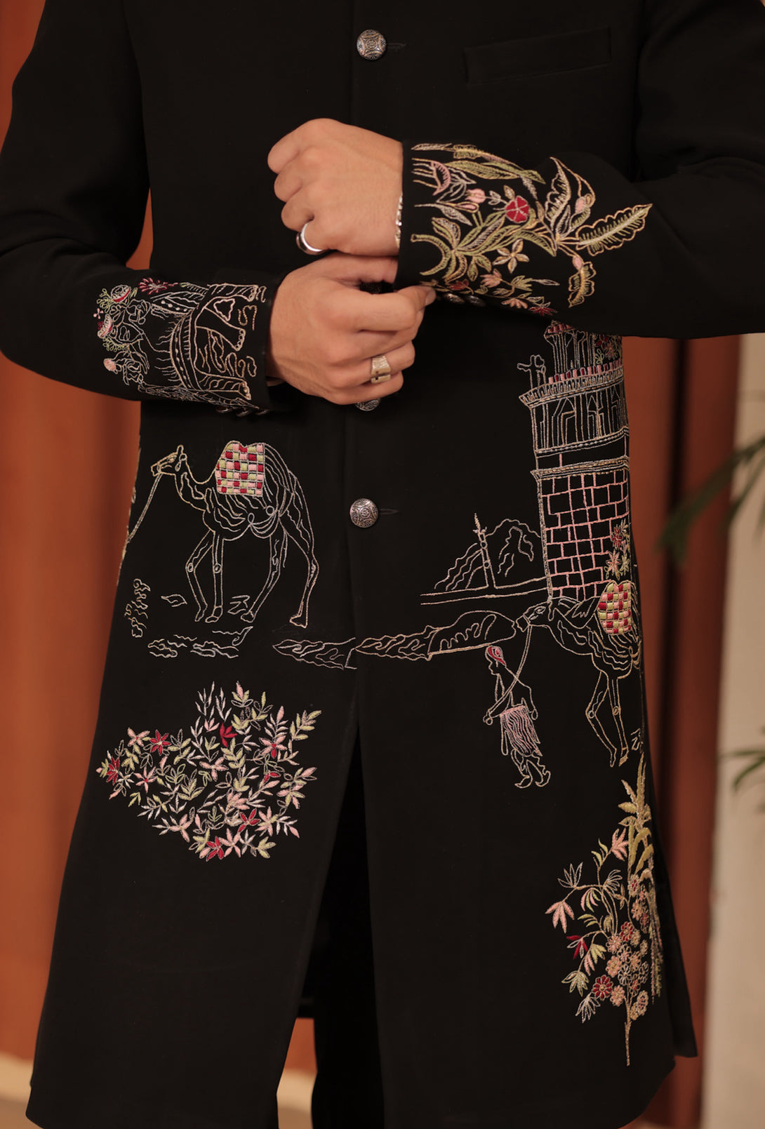 3 piece set, Kurta + Pants + Bandgala Colour: Black Fabric: Japanese Embroidery Details: Zari + Thread Embroidered Delivery Time: 20 days Wash Care: Dry Wash Only...