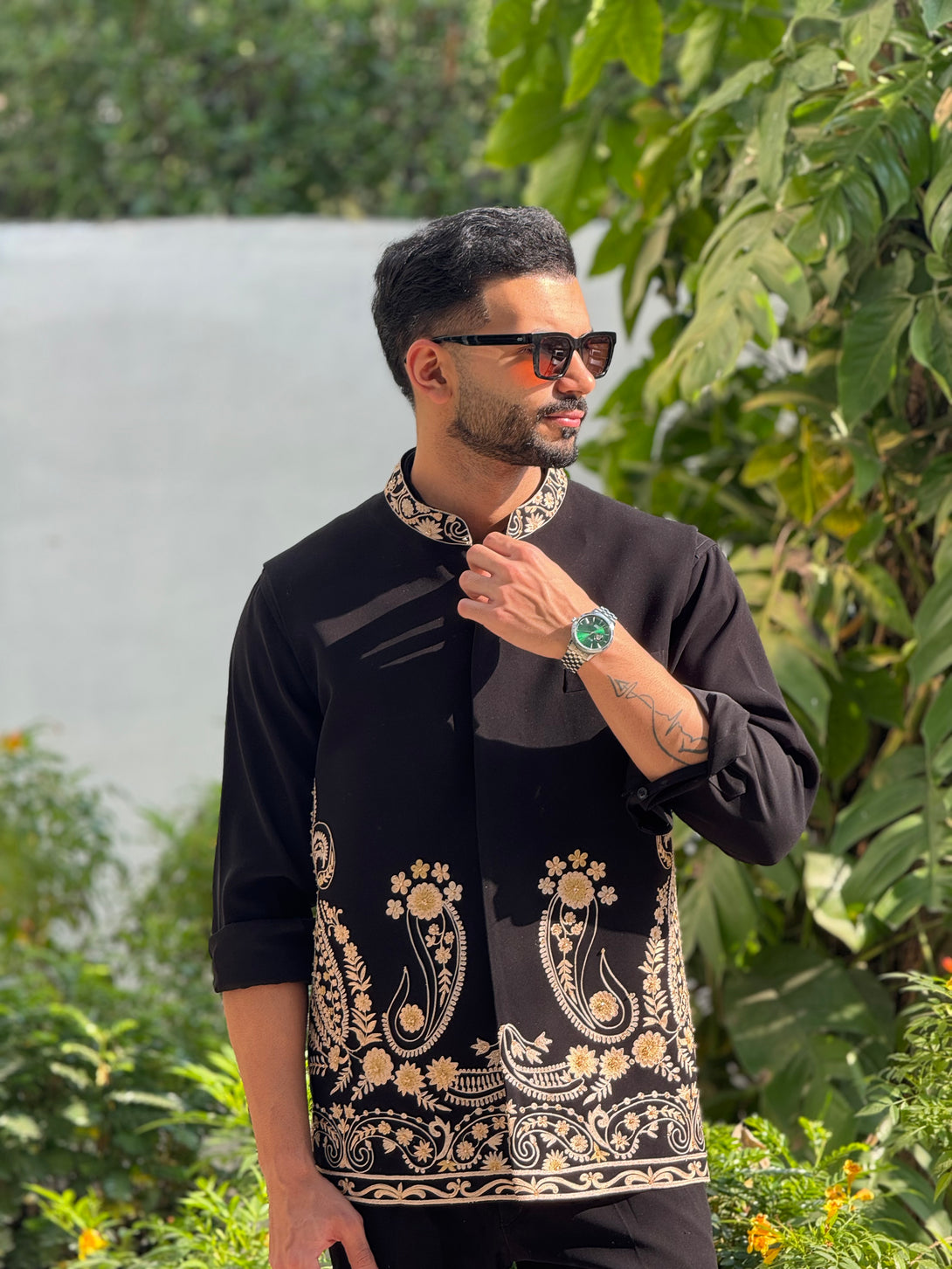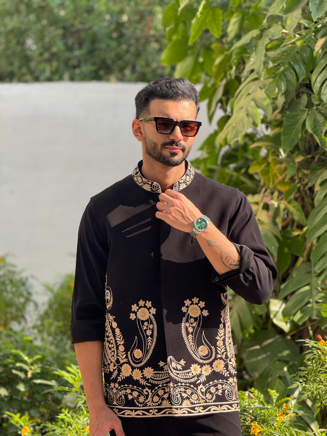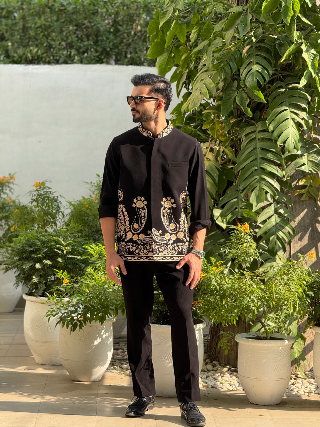 Colour: Black Fabric: Terry Rayon Components: Kurta and Trousers Embroidery Details: Bold Aari embroidered paisley motifs on the hem and bandhgala...