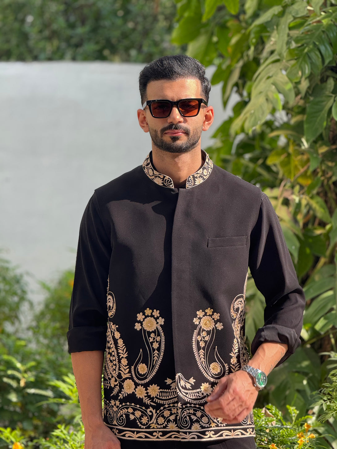 Embroidery Details: Bold Aari embroidered paisley motifs on the hem and bandhgala collar.