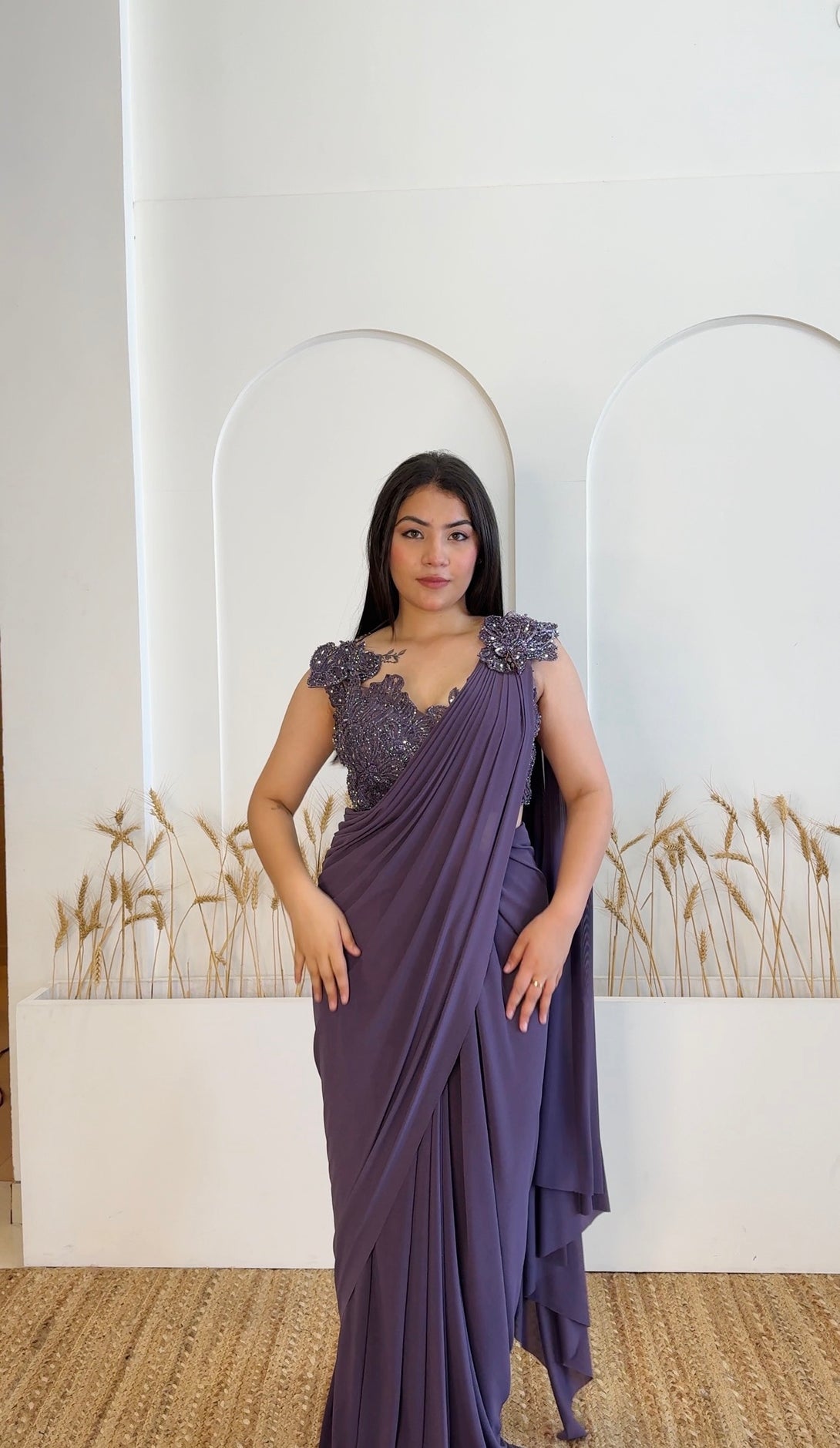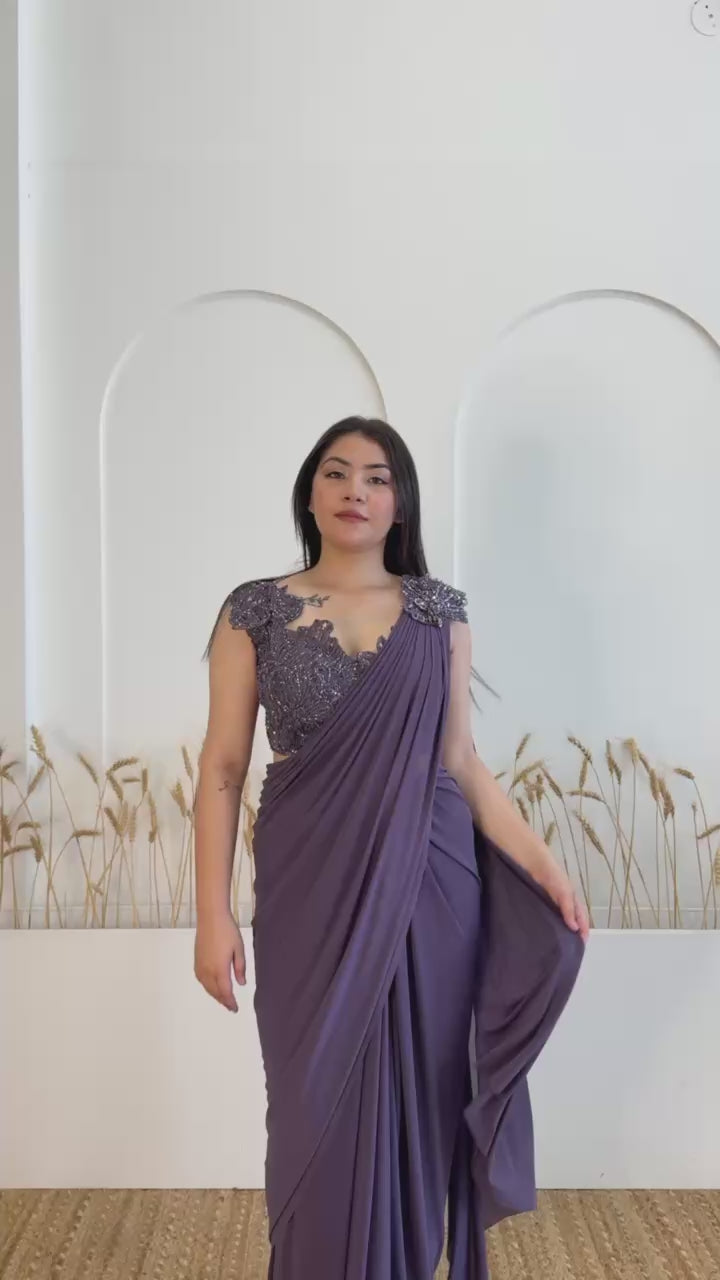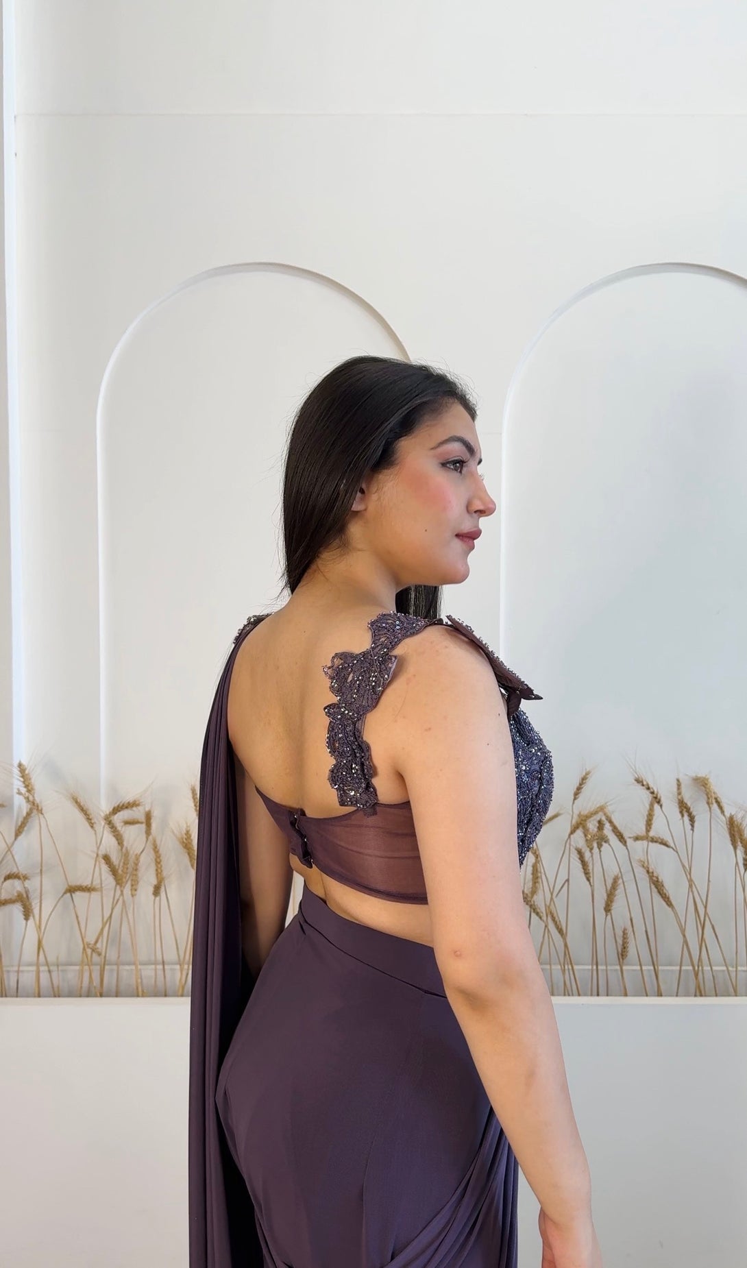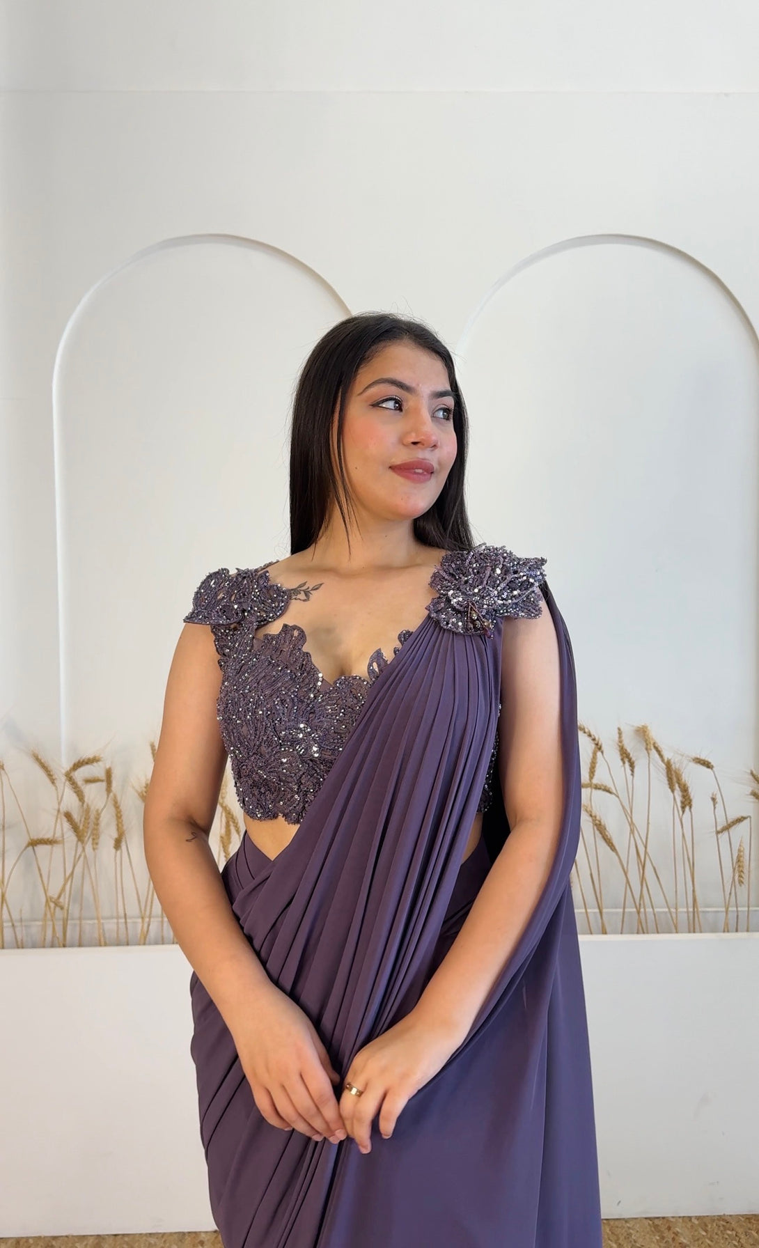 Colour: Deep Mauve Fabric: Stretch Georgette Drape Saree with Heavy Hand-Embroidered Cutwork Blouse Components: Embroidered Cutwork Blouse, Pre-Draped Georgette Saree Delivery...