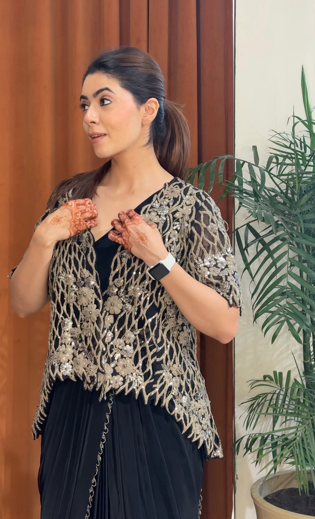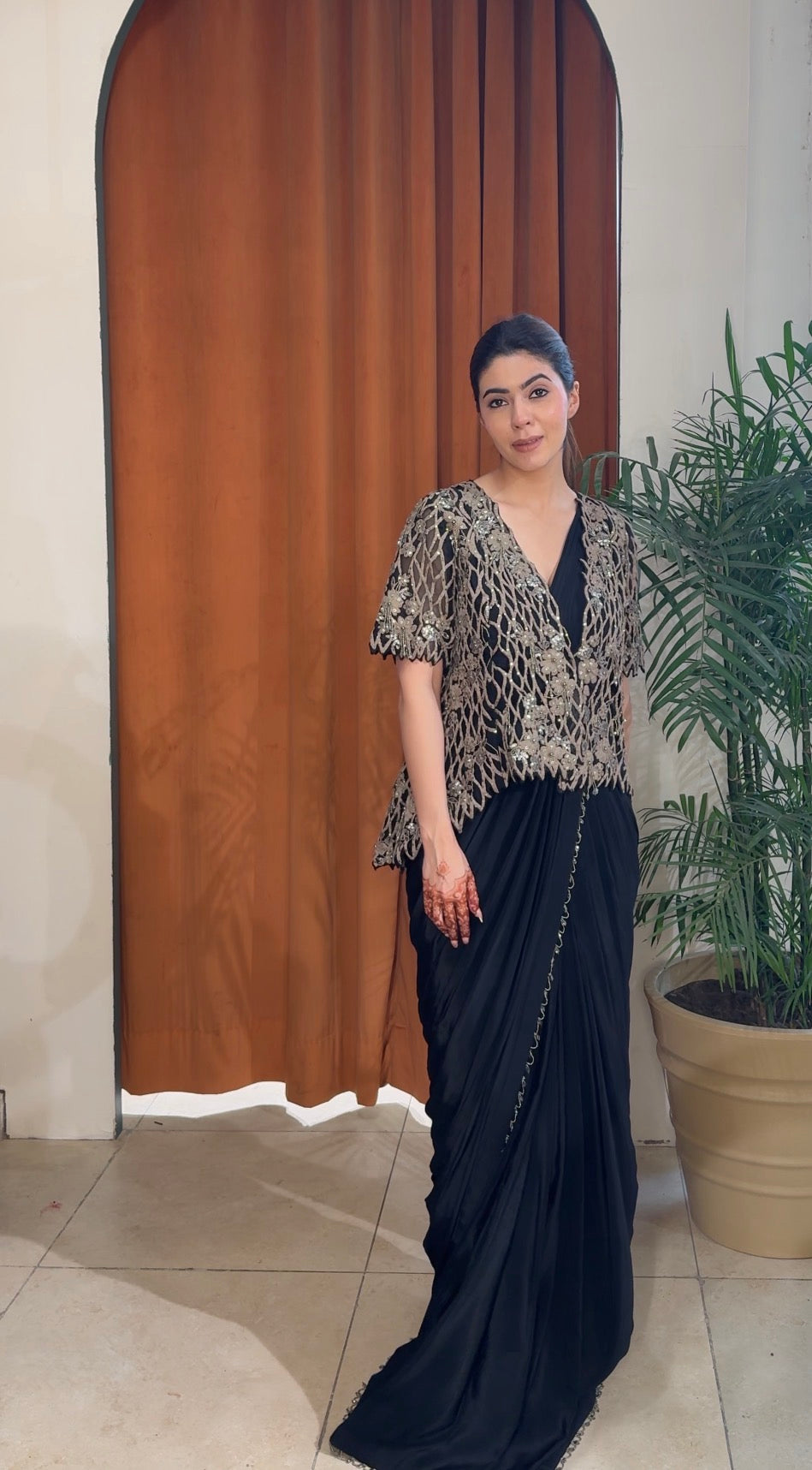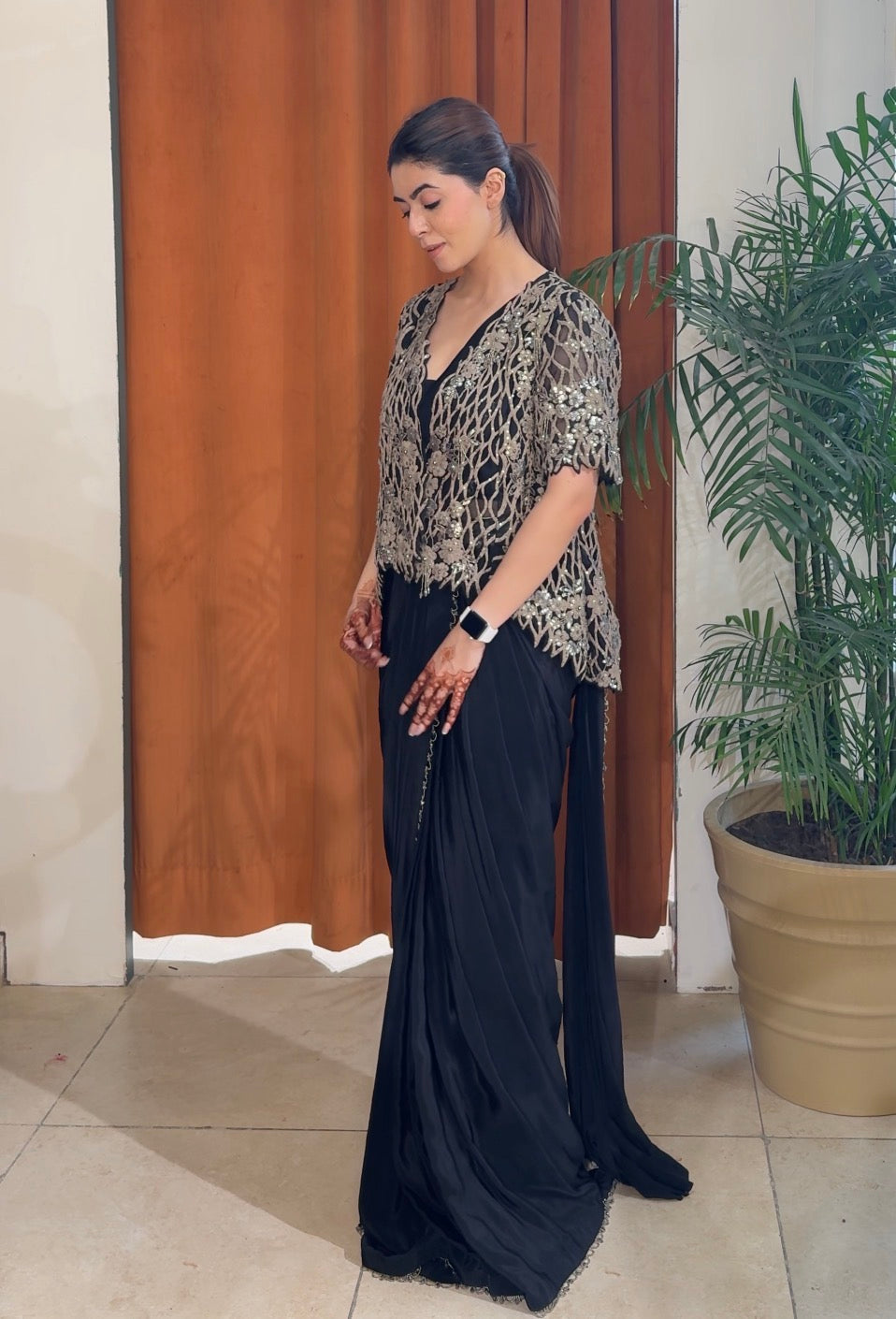 Colour: Black Fabric: Pleated Drape Saree with Net Embellished Jacket Blouse Components: Embroidered Jacket Blouse, Pleated Saree Delivery Time: 30 Days...