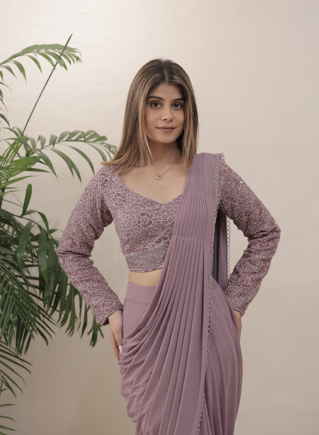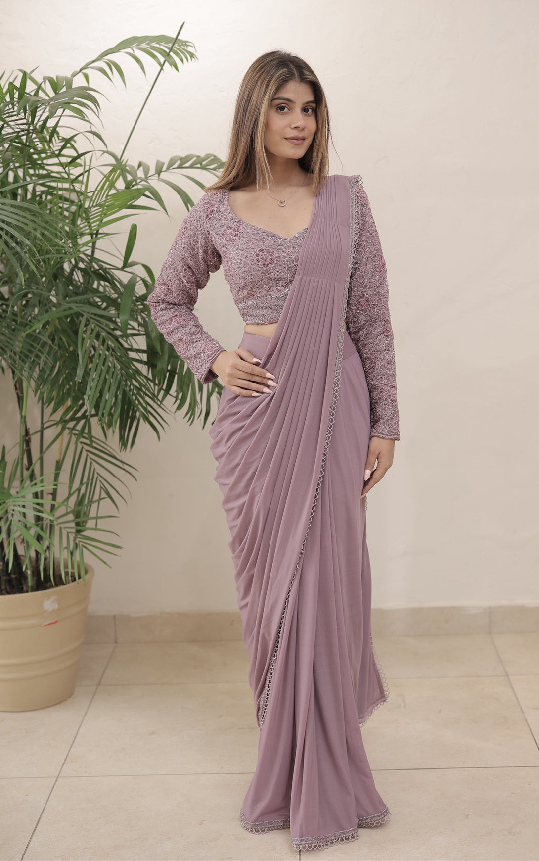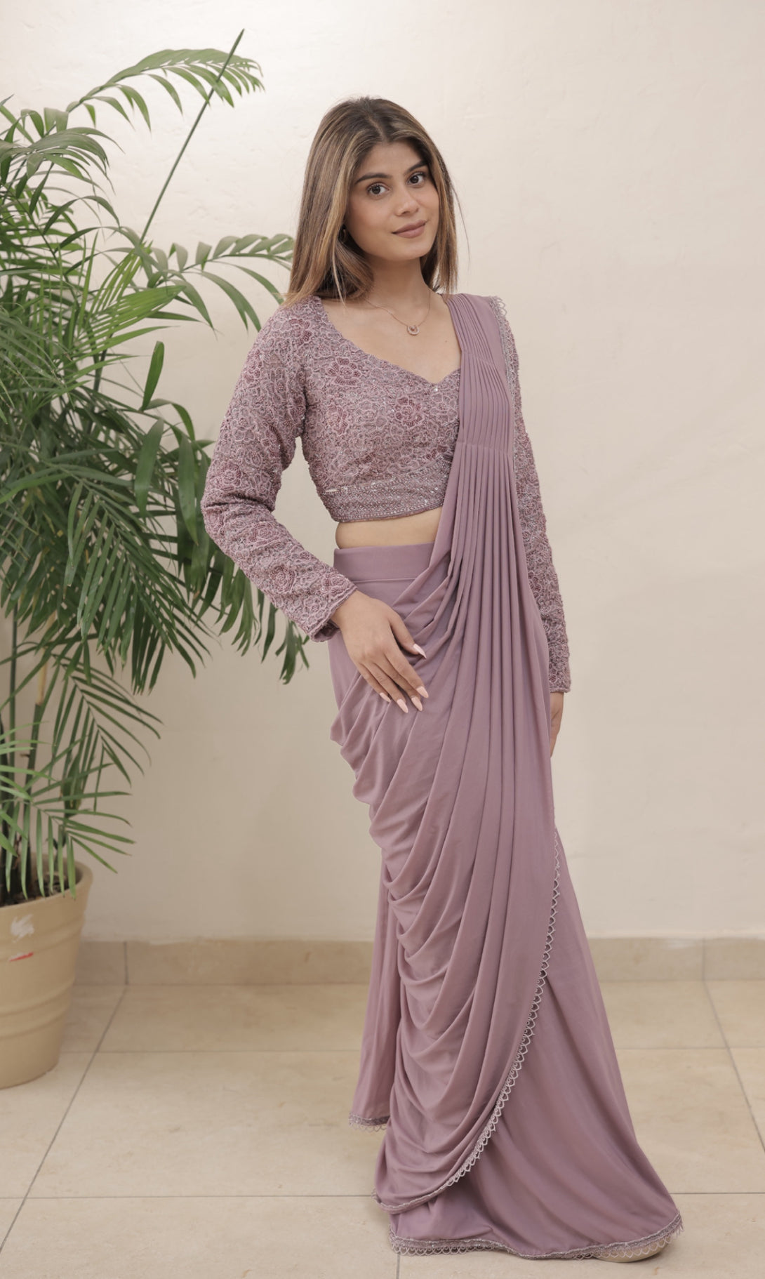 Fabric - Silk + Lycra Color: Lavender Embroidery Details: Hand Embroidered Delivery Time: 10 days Wash Care: Dry Wash Only Availability: Made To Order Customization Available: no