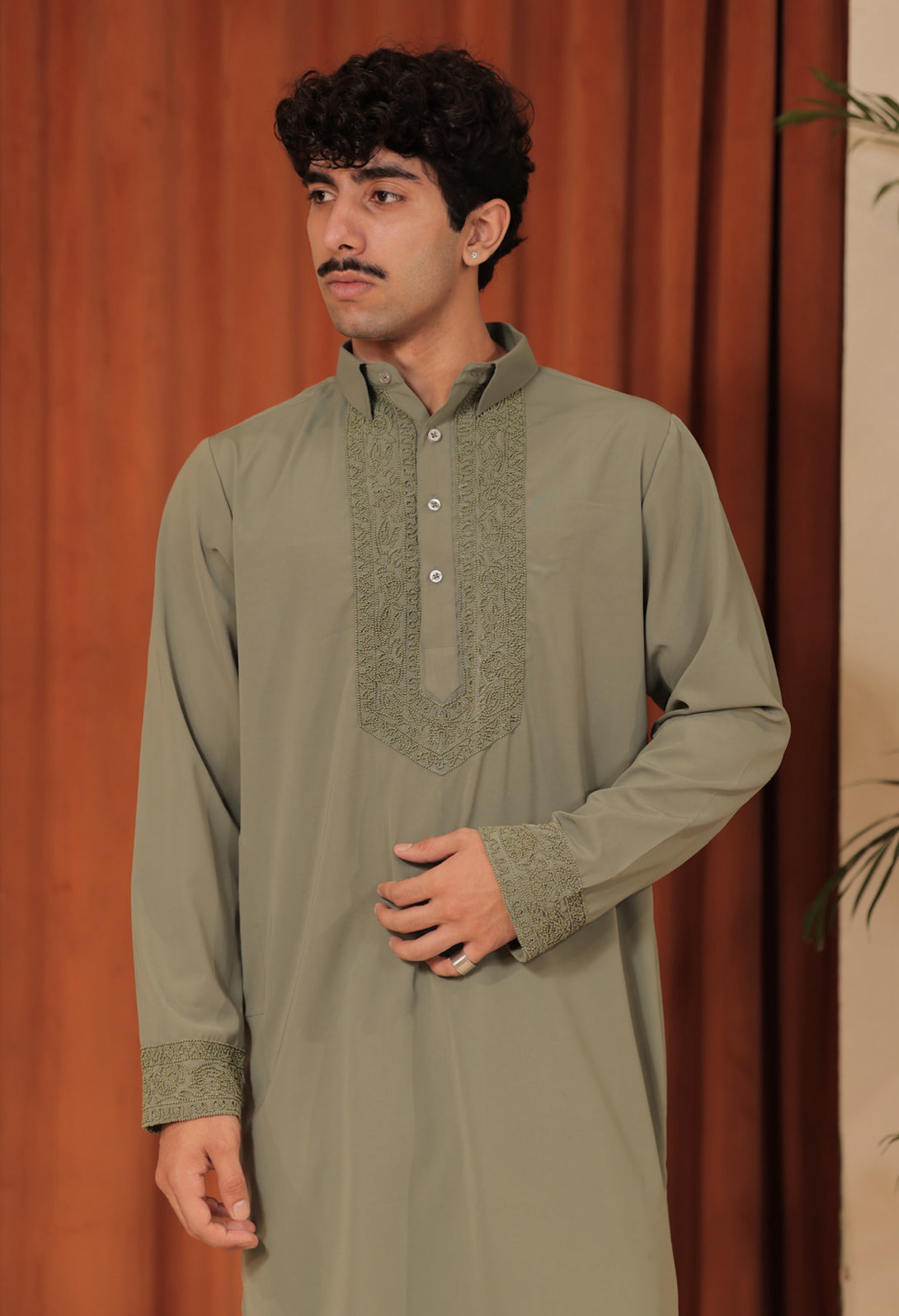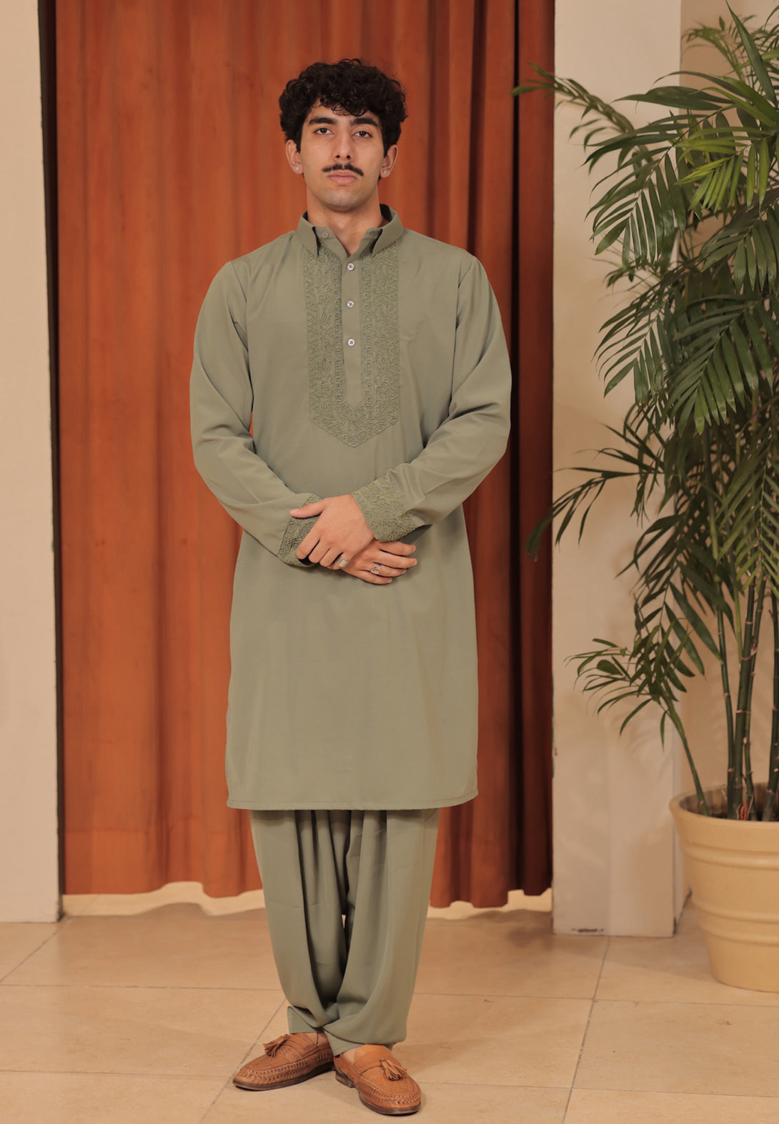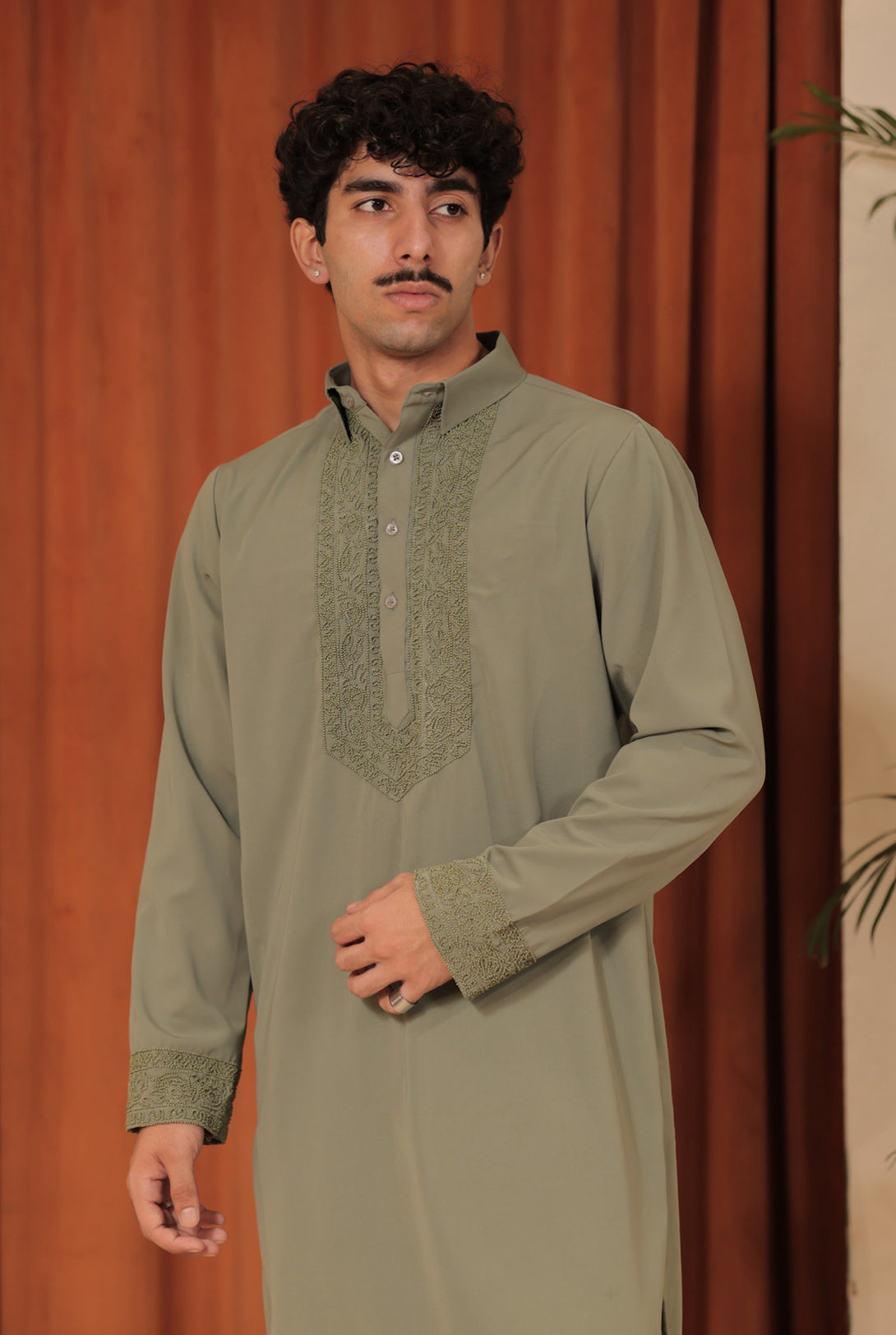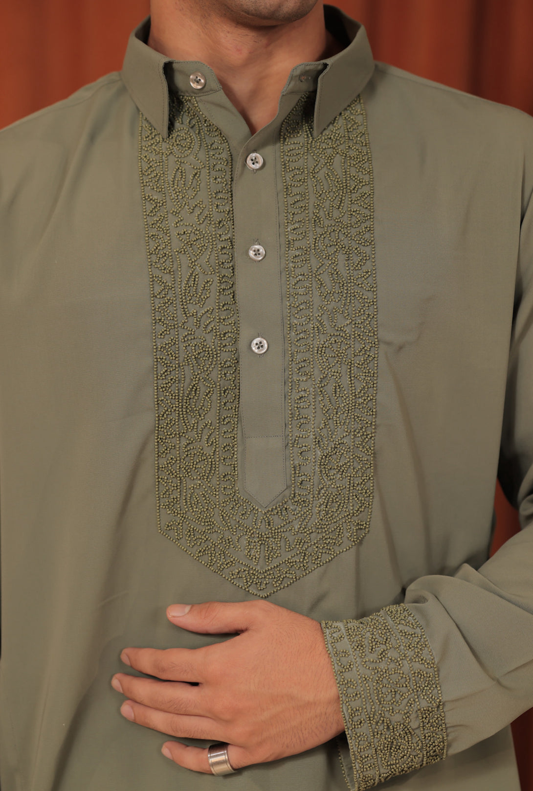 2 piece set, Kurta + Salwar Colour: Green Fabric: Japanese Embroidery Details: Hand Embroidered Delivery Time: 20 days Wash Care: Dry Wash Only Availability: Made To Order Customization Available: YES