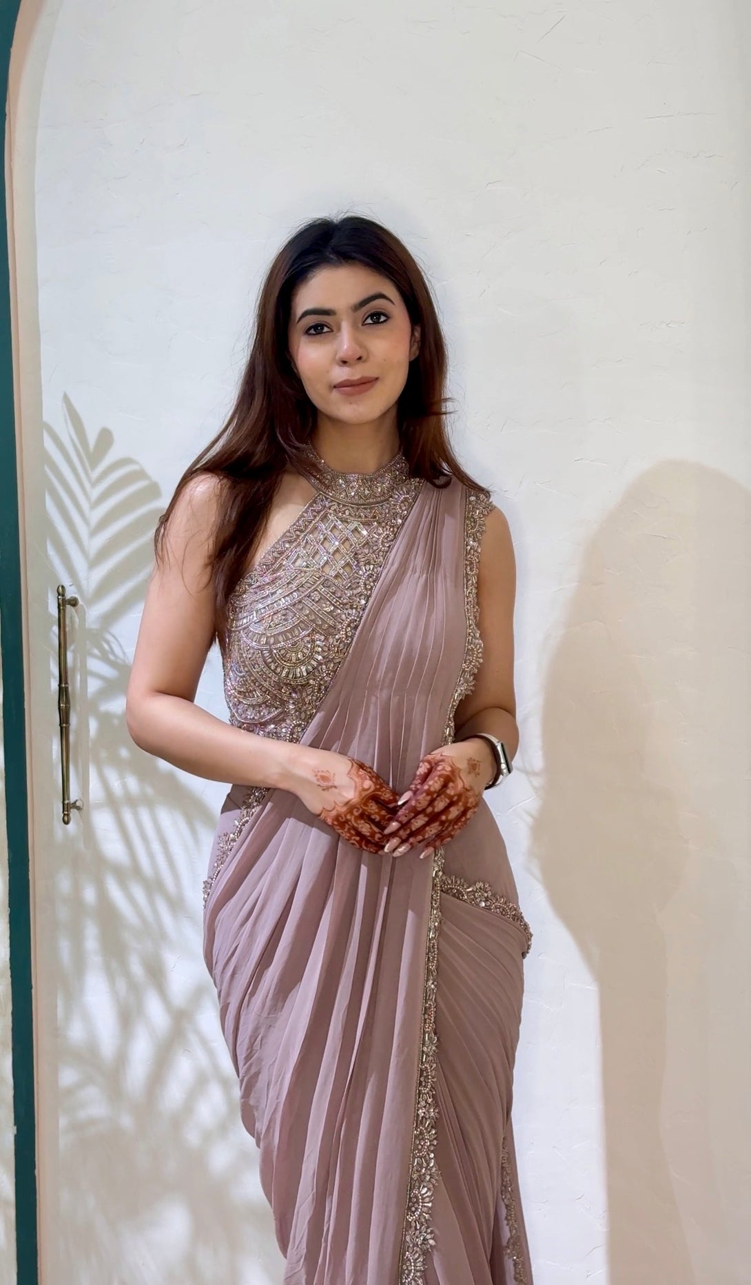 Components: Halter-Neck Embellished Blouse, Pre-Draped Chiffon Saree