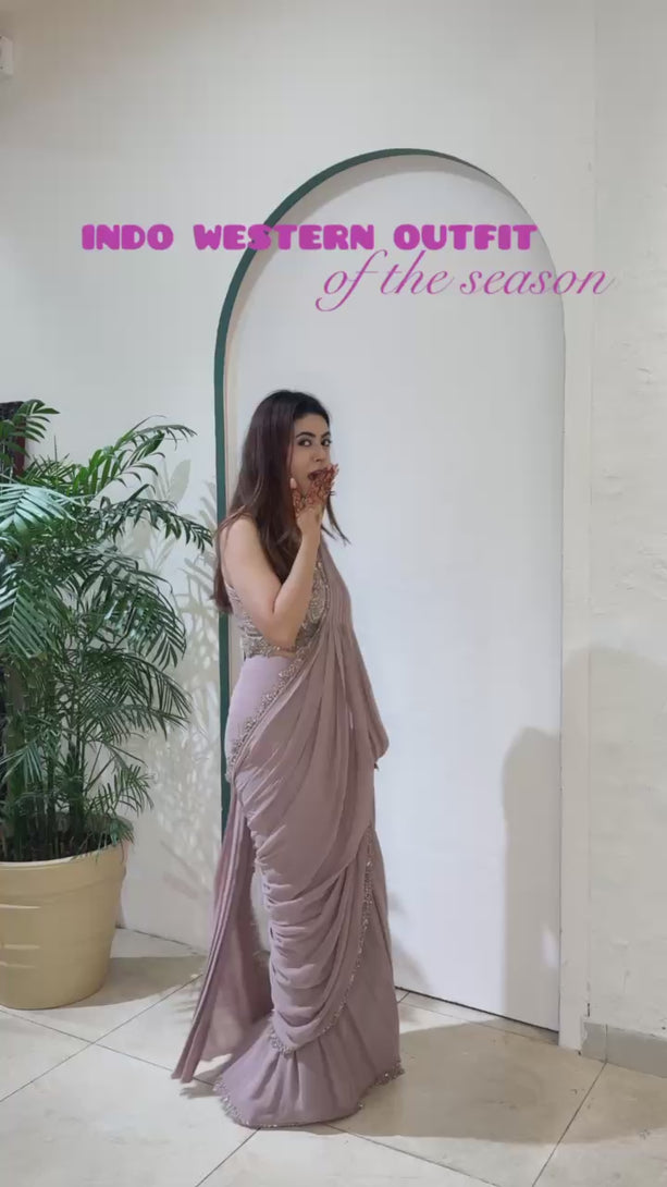 Colour: Lilac Fabric: Chiffon Drape Saree with Heavy Hand-Embroidered Halter-Neck Blouse Components: Halter-Neck Embellished Blouse, Pre-Draped Chiffon Saree Delivery Time: 30...