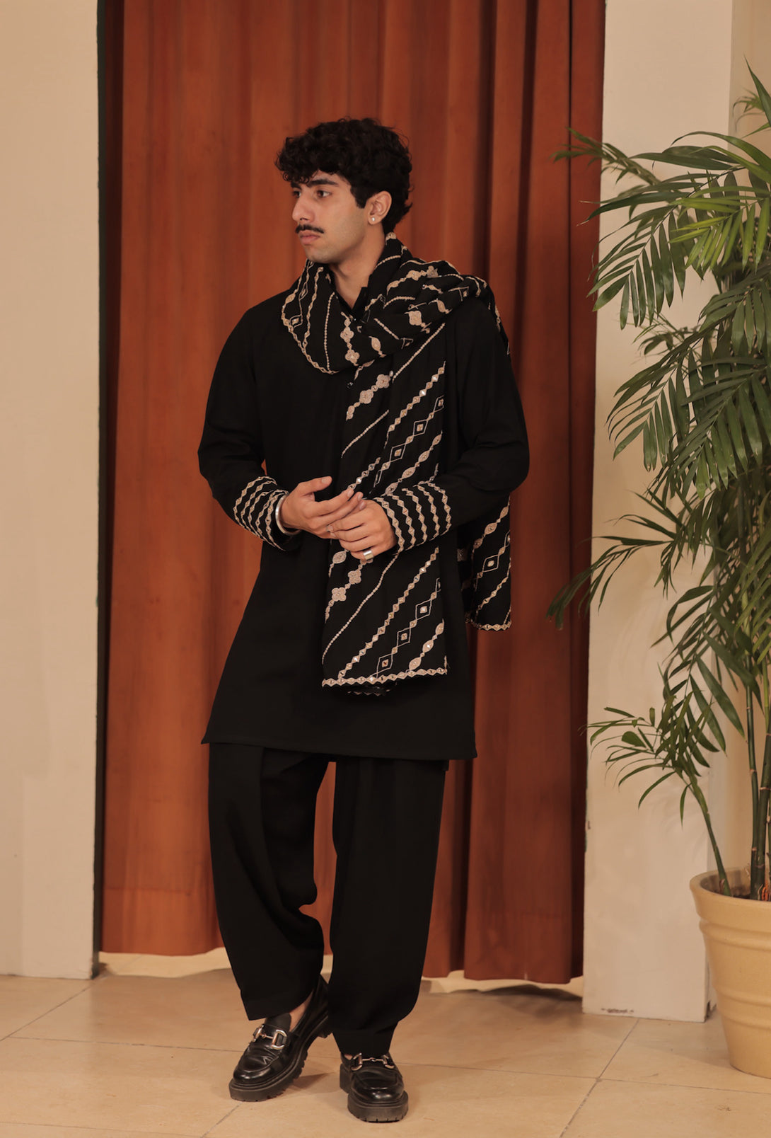 3 piece set, Kurta + Pants + Stall Colour: Black Fabric: Japanese Embroidery Details: Zari + Mirrror Embroidered Delivery Time: 20 days Wash Care: Dry Wash Only Availability: Made...