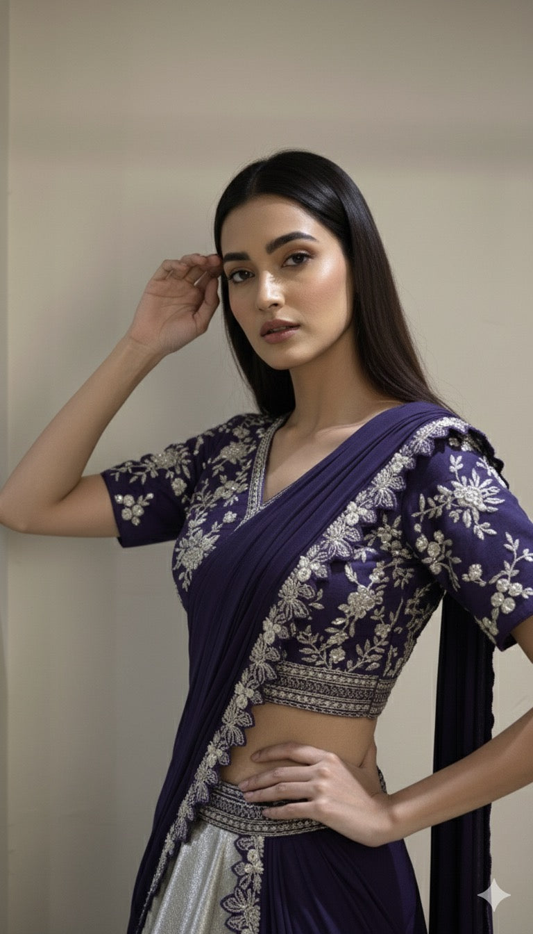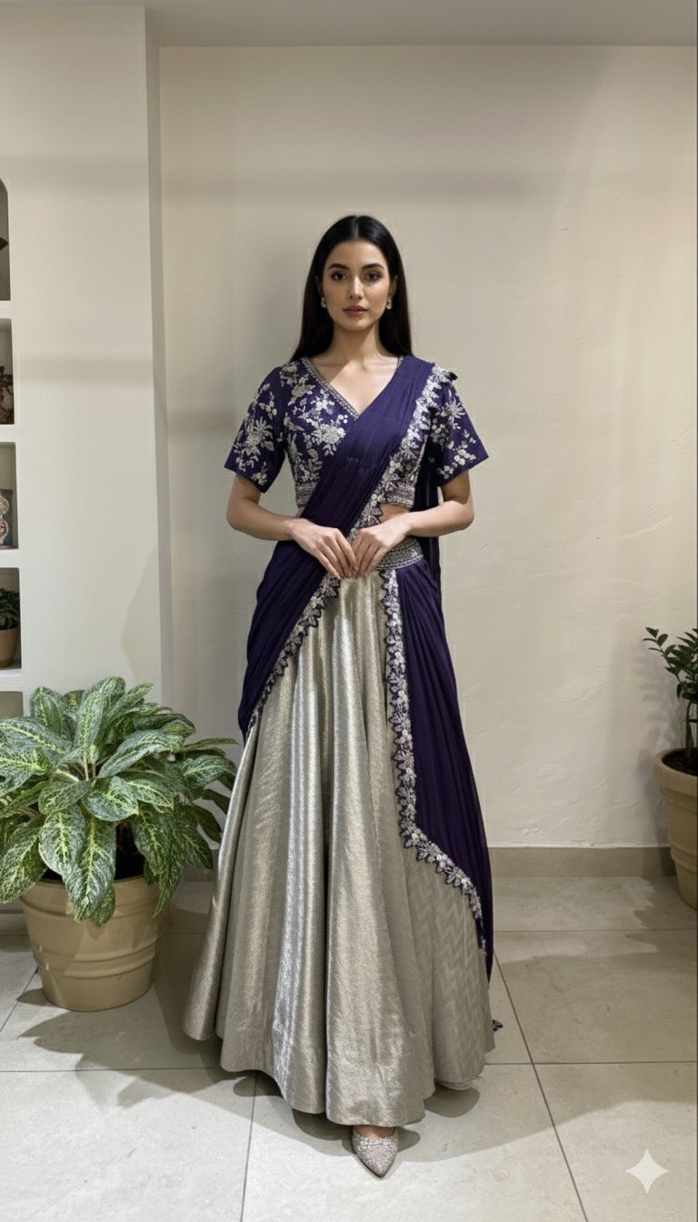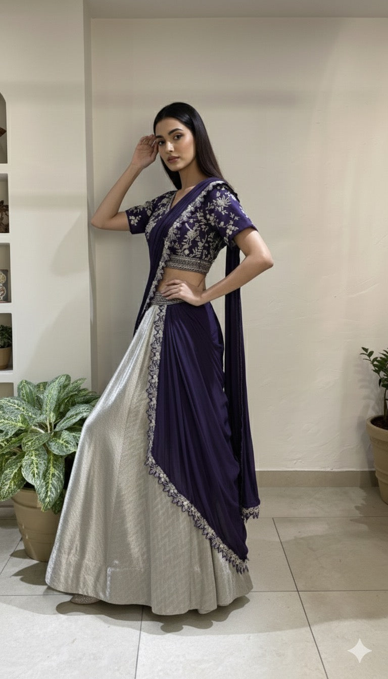Colour: Purple & Silver Fabric: Silk blend lehenga with georgette attached drape Components: Blouse, Lehenga & Attached Drape Embroidery Details: Heavy...