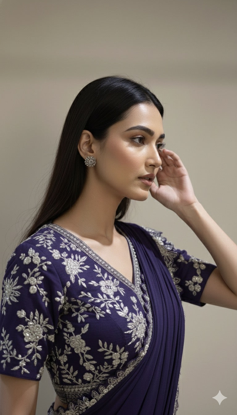Embroidery Details: Heavy silver thread, sequins & bead handwork on blouse and drape border