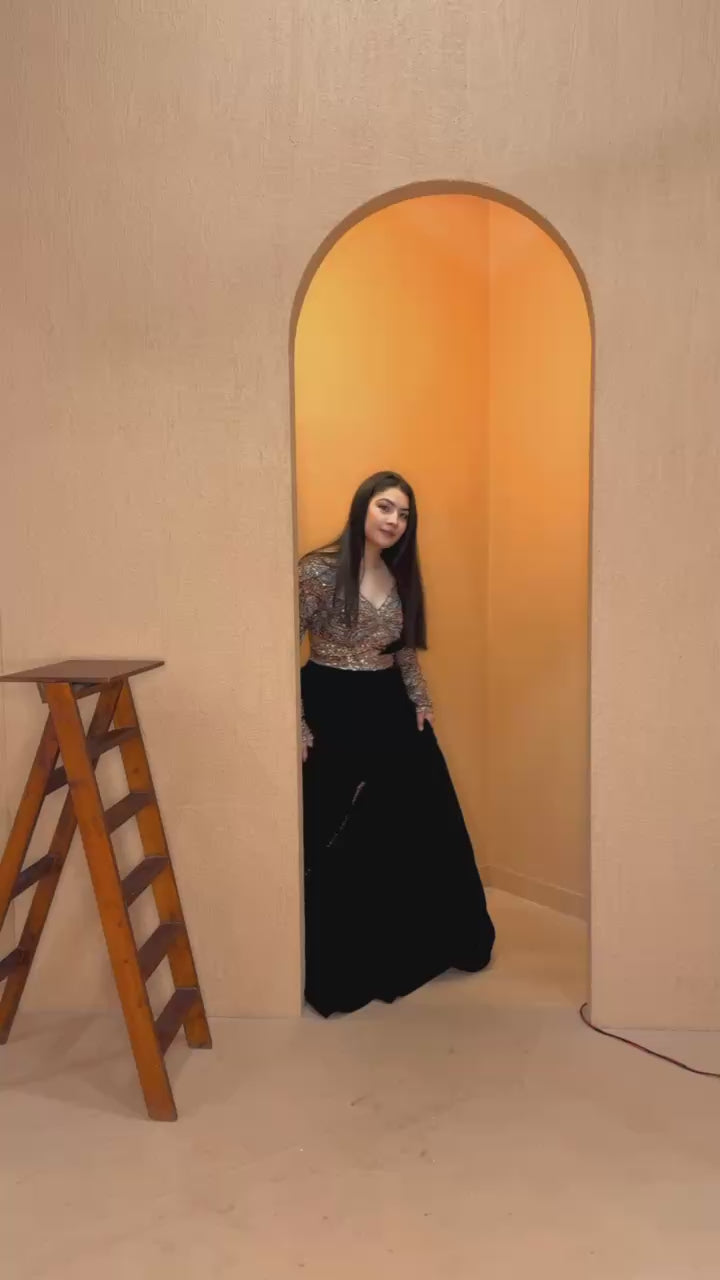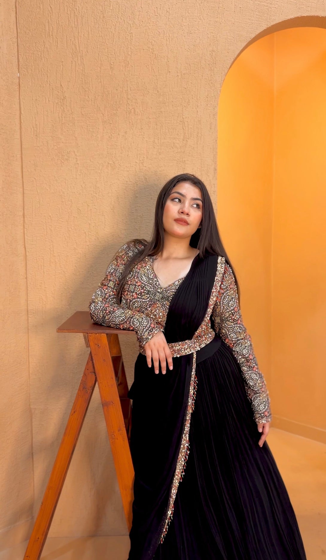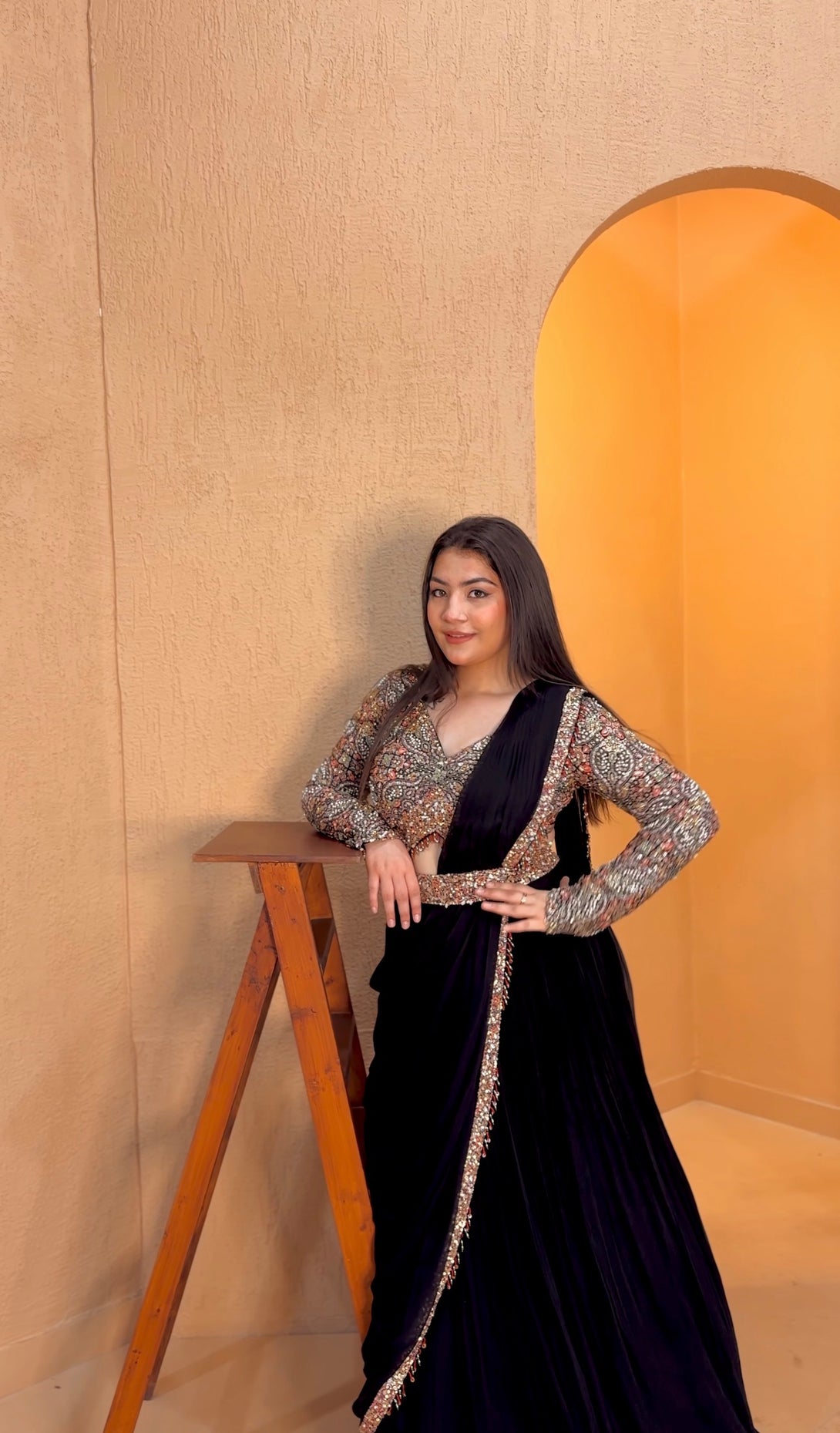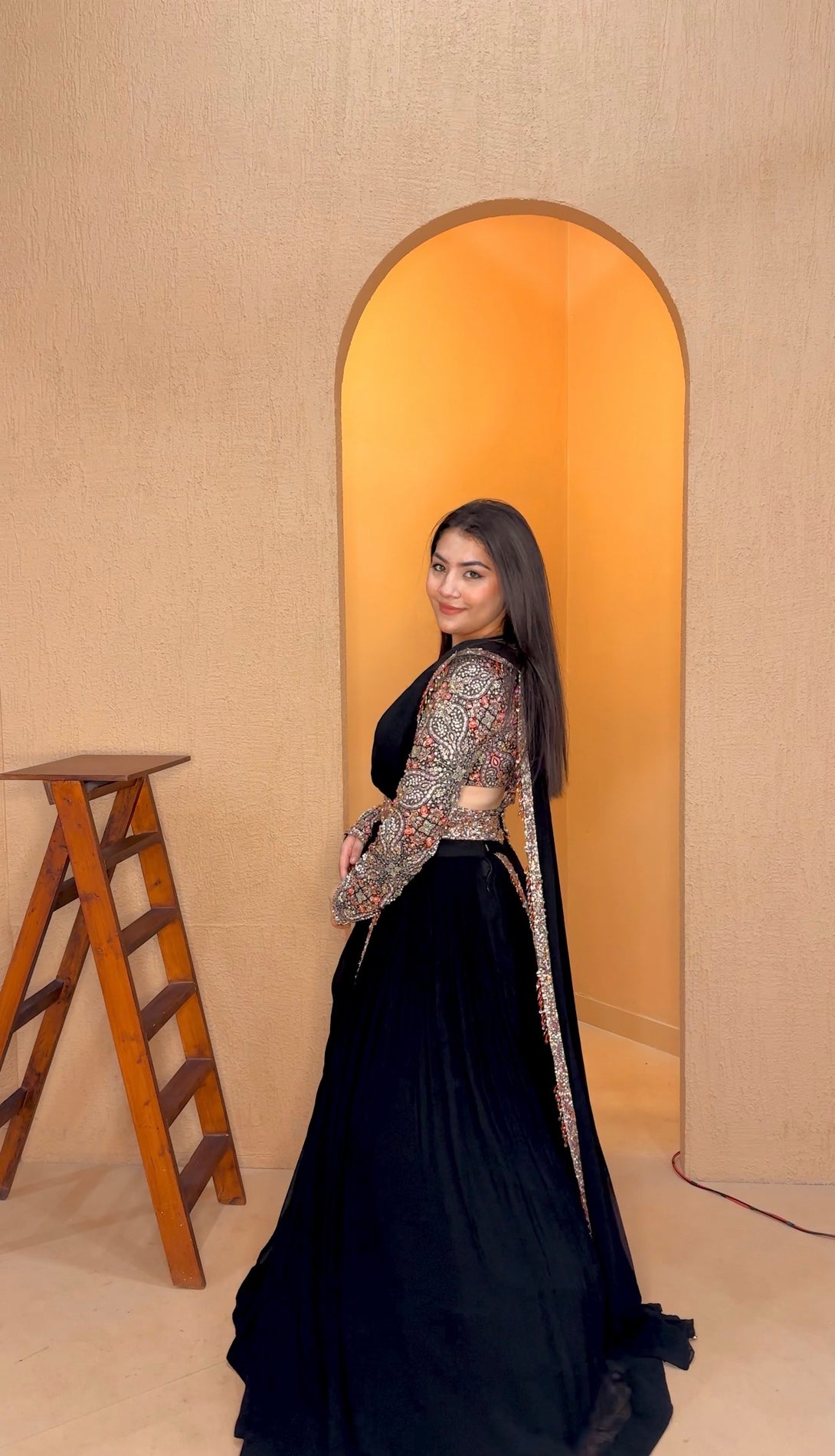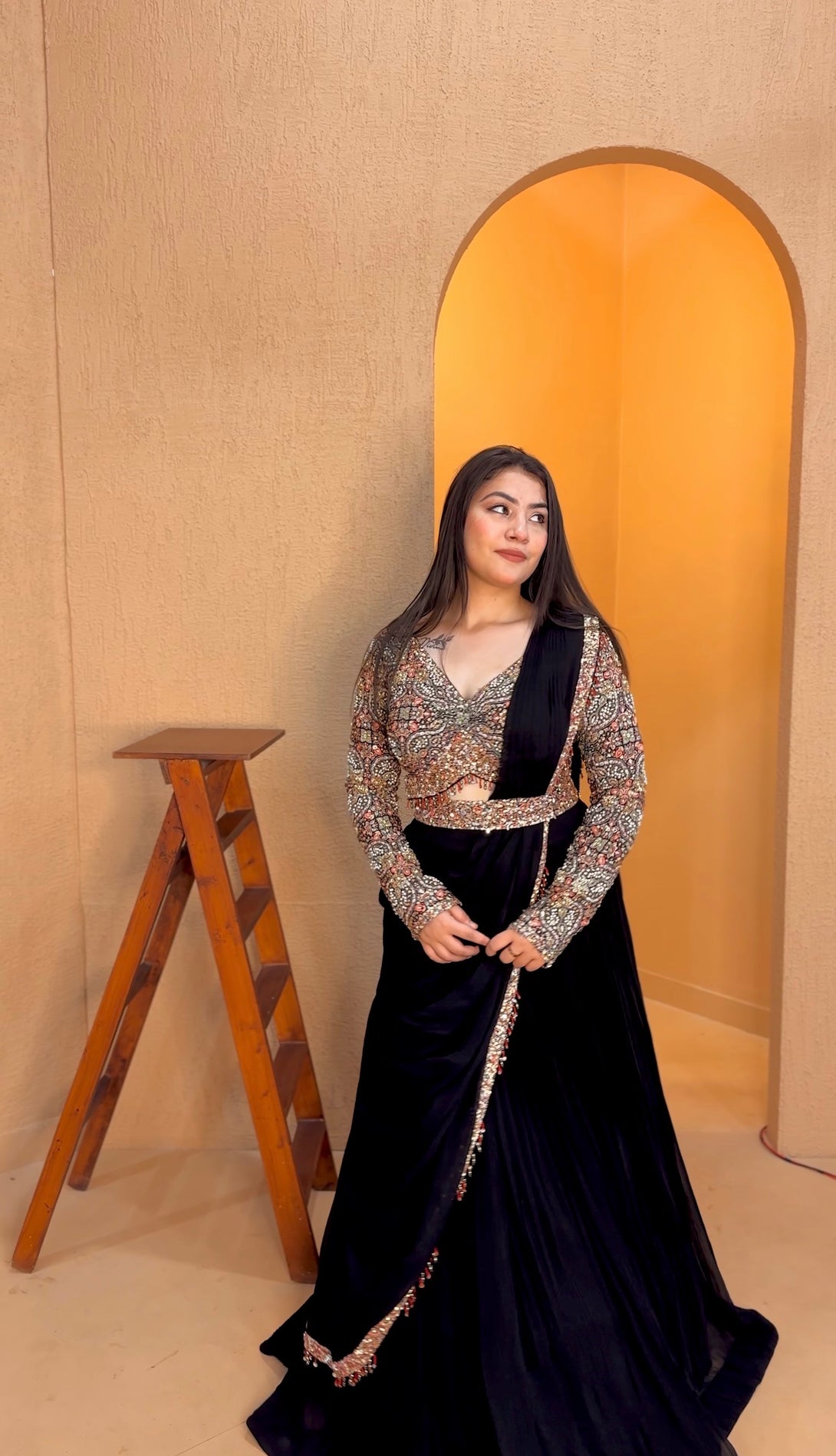 Colour: Black Fabric: Crush Draped Skirt with Heavy Sequin & Mirror Embroidered Blouse Components: Full-Sleeve Embroidered Blouse, crush Draped Skirt, Embellished...