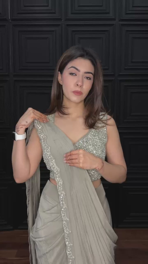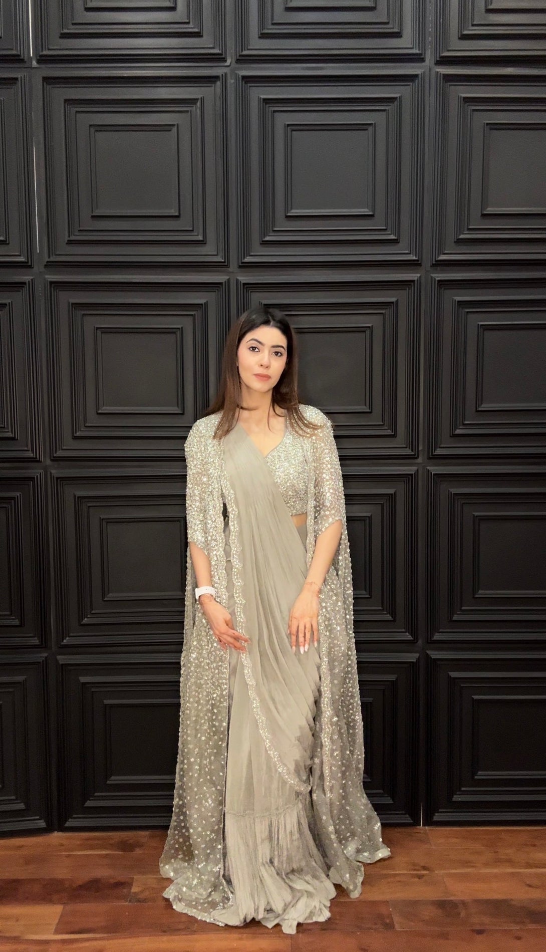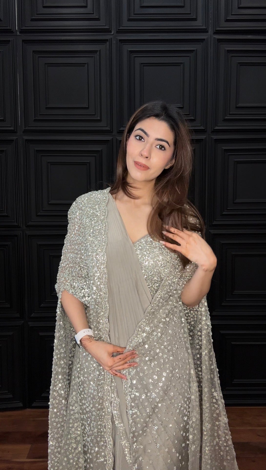 Colour: Silver Grey Fabric: Georgette Drape with Fully Hand-Embroidered Sequin Cape & Blouse Components: Embroidered Cape, Sequin Blouse, Pre-Draped Saree Delivery...
