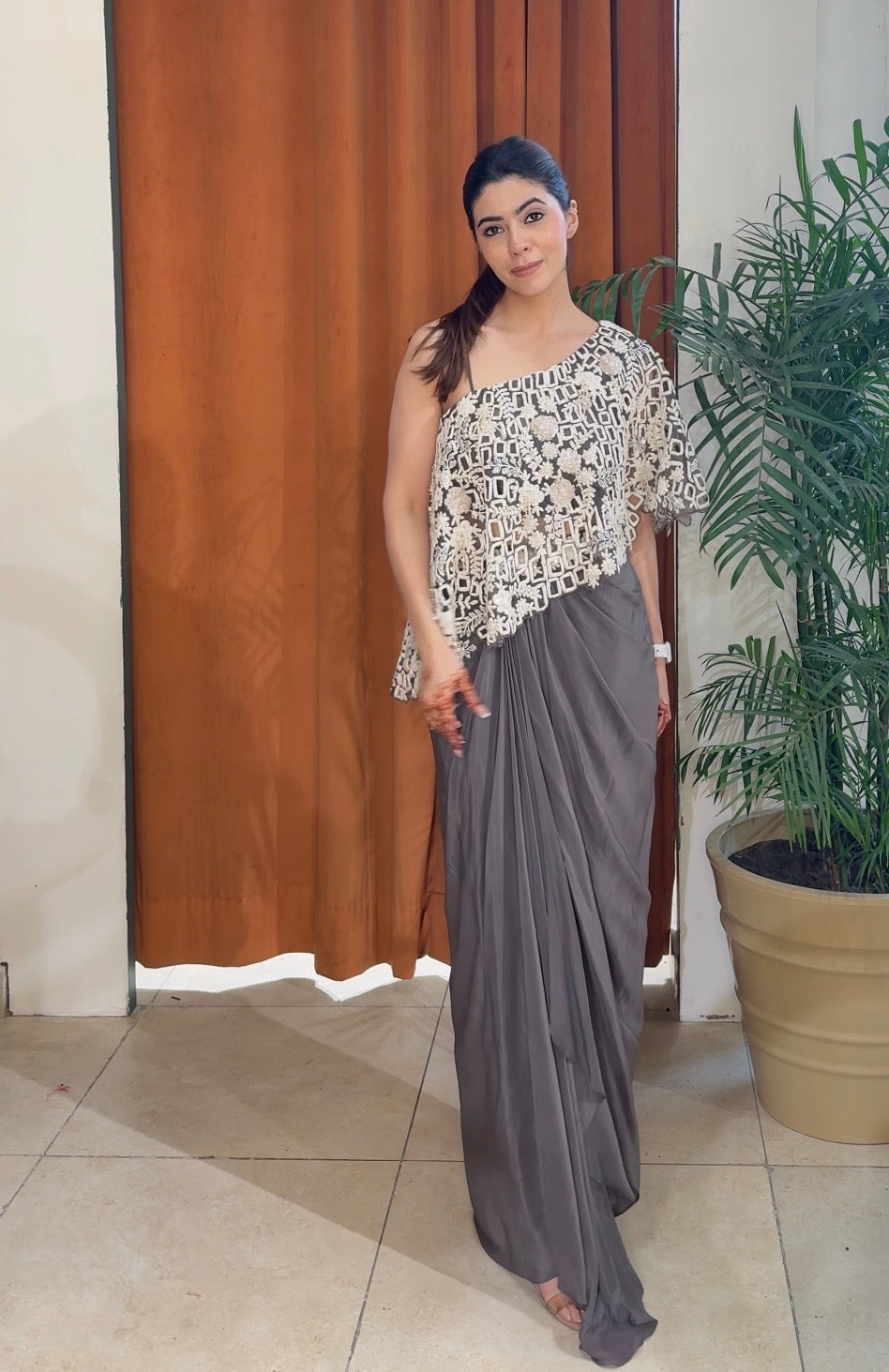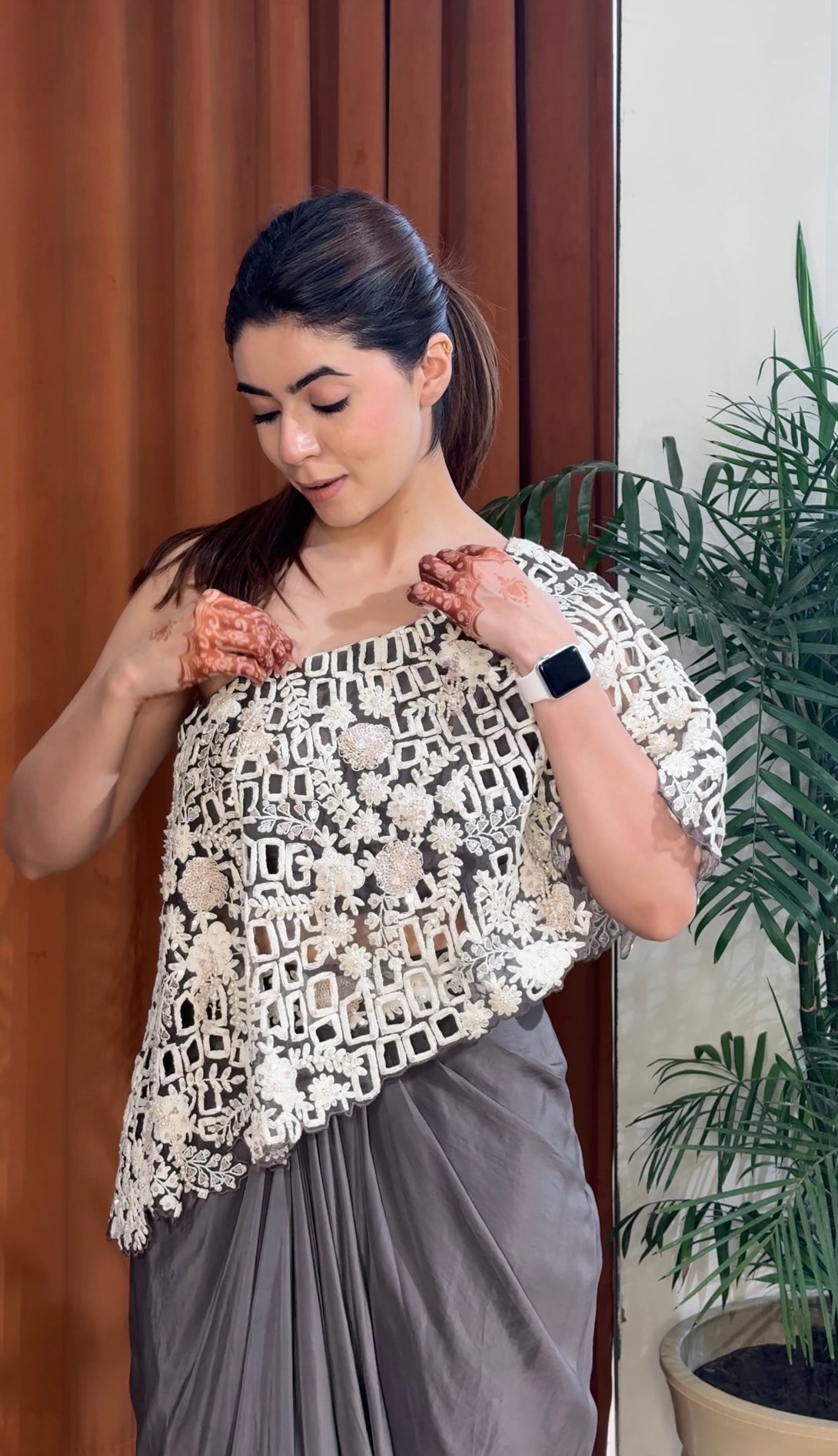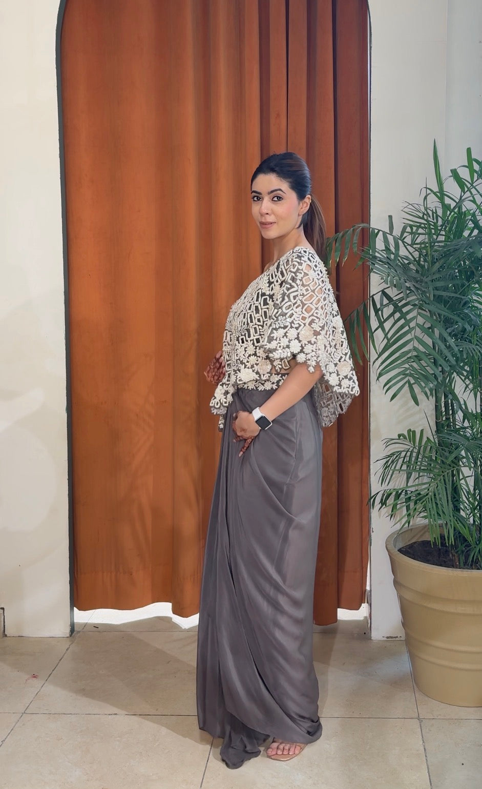 Colour: Ivory & Slate Grey Fabric: Heavy Embroidered Net Cape with Satin Drape Skirt Components: Embroidered Cape Top, Bustier and Drape...
